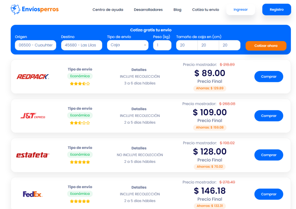 Explora las opciones de envío: Una vez que hayas ingresado los datos, la plataforma te mostrará un listado con las mejores alternativas para tu envío. Ten en cuenta que los precios pueden variar según las dimensiones del paquete, el destino y los proveedores seleccionados. Revisa las opciones y elige la que mejor se adapte a tus necesidades y presupuesto.