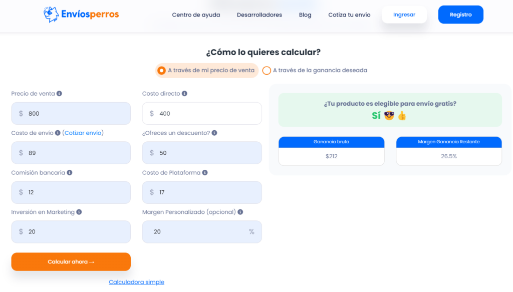 Además de cotizar tus envíos, con la calculadora que te ofrece Envíosperros puedes descubrir si es rentable para tu negocio ofrecer entregas gratis a tus clientes.